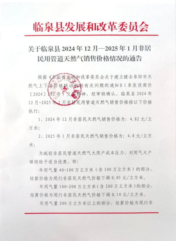 關(guān)于臨泉縣2024年12月-2025年1月非居民用管道天然氣銷售價格情況的通告