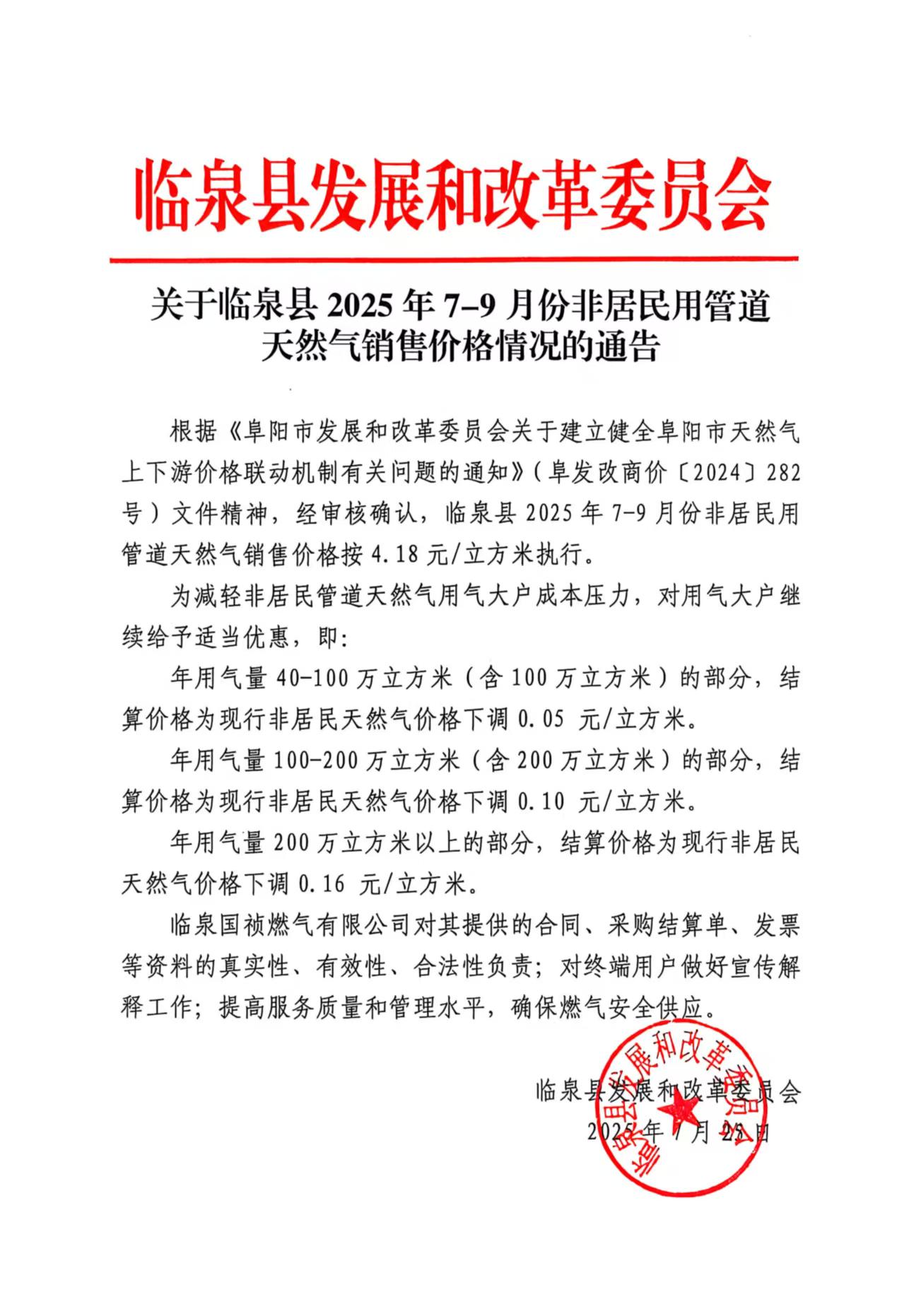 關(guān)于臨泉縣 2025年10月份非居民用管道天然氣銷售價格情況的通告