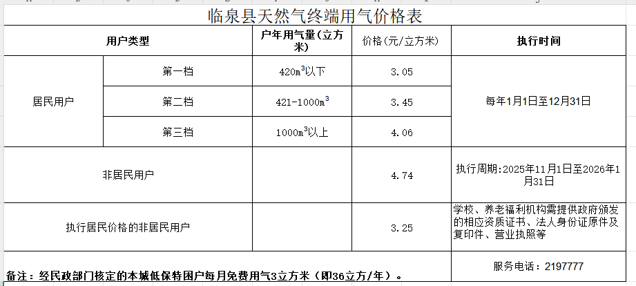 關(guān)于臨泉縣 2025年10月份非居民用管道天然氣銷售價格情況的通告